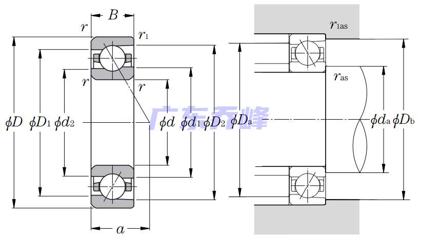 | 單列角接觸球軸承 - Ultage系列 - 尺寸 | |
