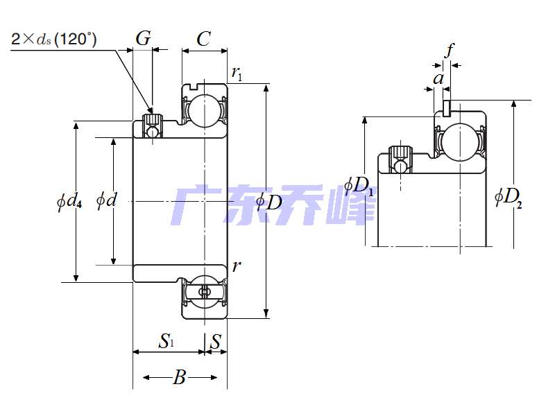 | 帶緊定螺釘的外球面軸承,狹窄內圈 - 圓柱內徑,帶止動環 - 尺寸 | |