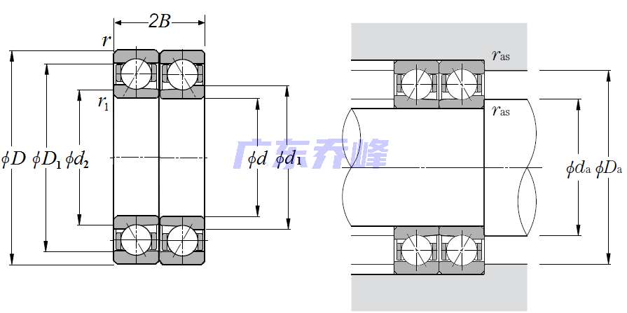 | 電機和車床用雙列角接觸球軸承 - 背對背配對 - 尺寸 | |