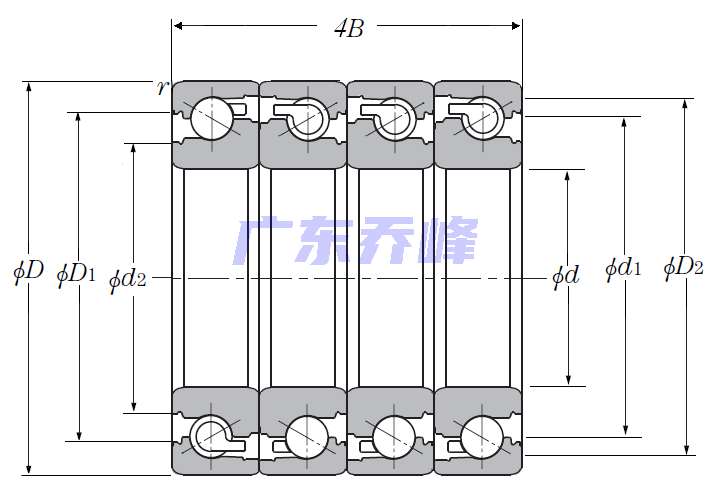 | 滾珠絲杠用四列角接觸推力球軸承 - DFTT配對(duì),開式,三排承受軸向載荷 - 尺寸 | |