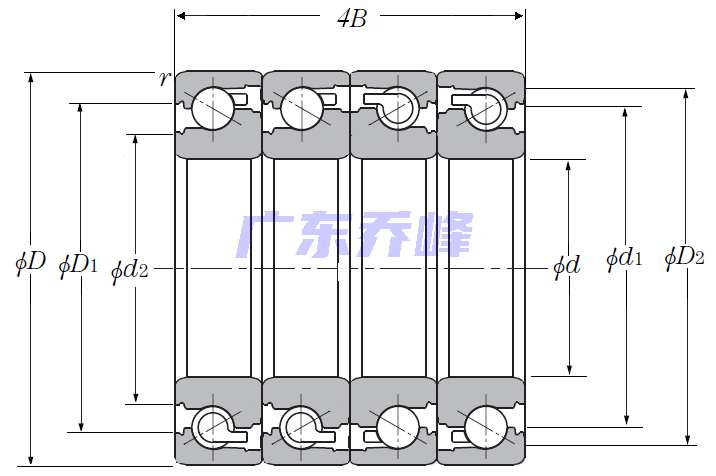 | 滾珠絲杠用四列角接觸推力球軸承 - DTFT配對,開式,兩排承受軸向載荷 - 尺寸 | |