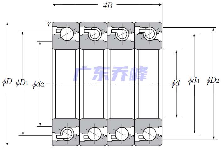 | 滾珠絲杠用四列角接觸推力球軸承 - DTTT配對,開式,四排承受軸向載荷 - 尺寸 | |