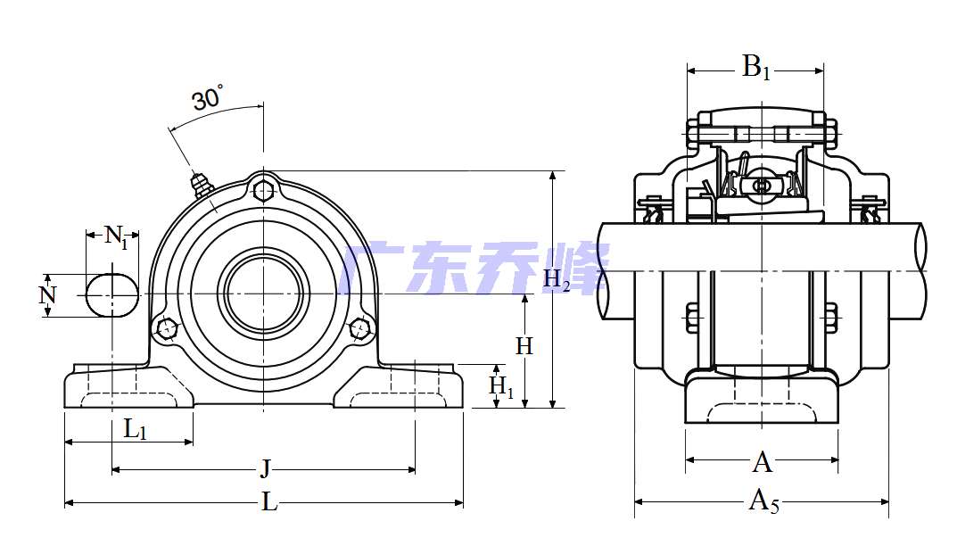 | 軸承座,帶緊定襯套,鑄造防塵蓋,開式端蓋,UKP型 - 尺寸 | |