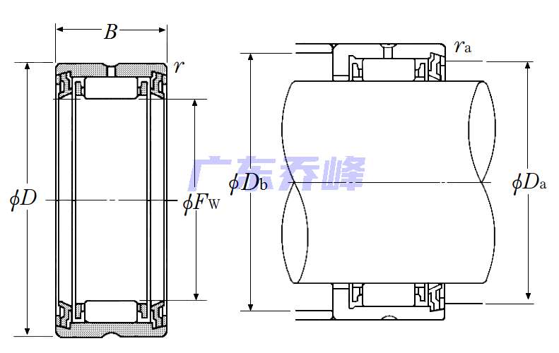 | 機加工滾針軸承不帶內圈 - RNA49系列,雙面密封 - 尺寸 | |